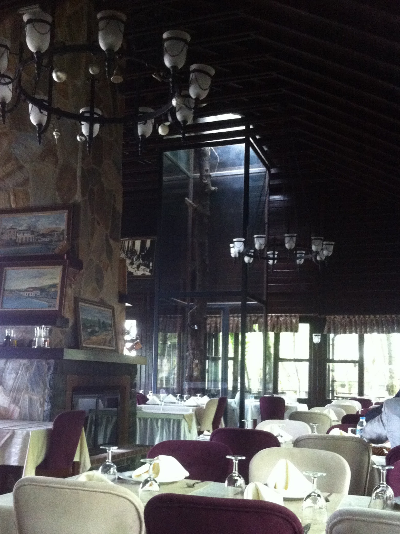 I was getting tired and started looking for a place to stay. After quite a while I found a place by the road, behind a gas station. I wasn’t ready for that either. The place was beautiful, it had fancy bungalows with fireplaces and cute paths with wooden bridges, very fairy tale like. I loved the restaurant too, instead of cutting down a tree they built the restaurant around the tree and encased it in glass.