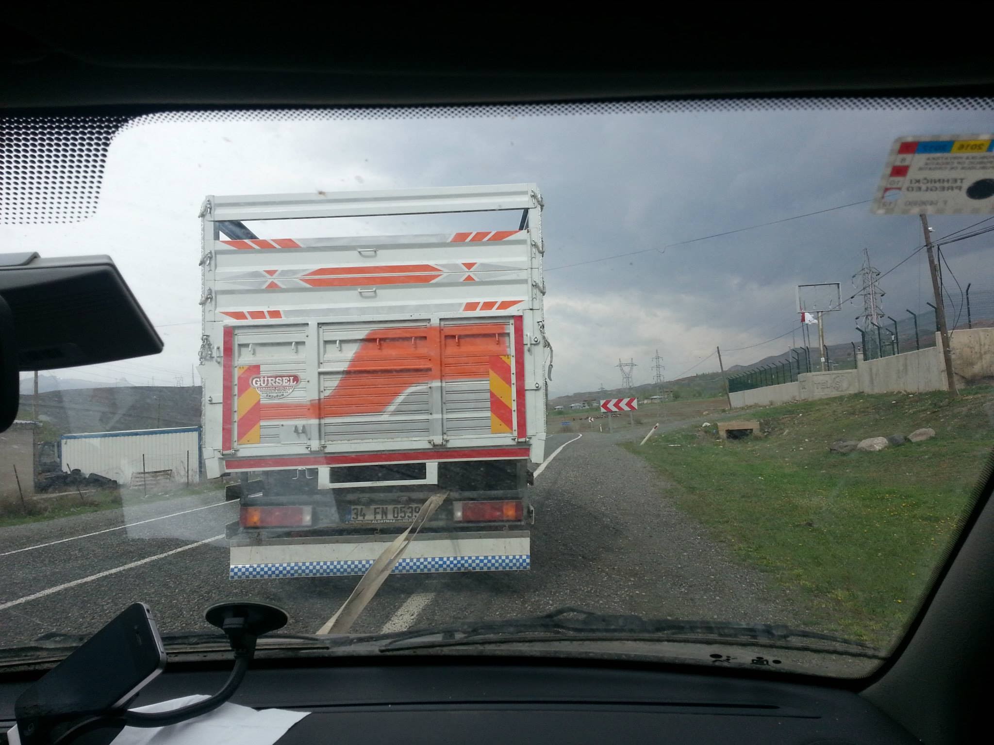 But in the morning clio starts and we can be on our way. We say our goodbyes, thank them. They won’t hear of taking any money. We get to the main road and clio dies again. My superhuman mechanics skills narrow the problem down to the fuel pump. Murat’s friend comes along with his truck. Hamalihamali wave wave, they’ll take us to the nearest civilization for 100 money (not the bigger city we talked about with Murat the night before). So they’re towing us.