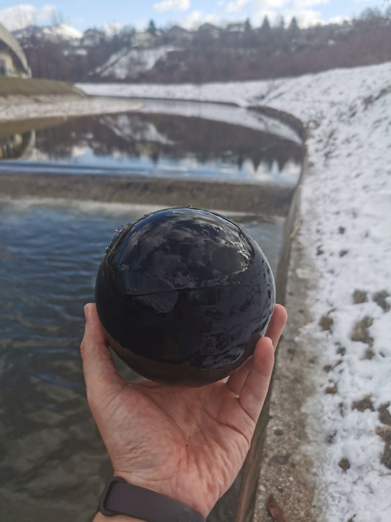 In one such trap a black ball caught my eye. It was much more lively than the rest of the captives, it would actually jump up in the air after it would get pulled under by the flow. And it would get much further out than the others before being pulled back in. So far out that it looked like it would actually break free from the vortex but then, just when I thought it could make it, it would get pulled back in. I stood and watched for a while. The energetic little ball struggling to move on, getting soooo close and failing time and time again. What a perfect metaphor for life, I thought. But the next day I came back to the same spot and it was gone! All the others were still there but the brave little black one was gone! I continued downstream and found it in the next waterfall, fighting the next battle. I told my friends about it and now the ball had fans cheering it on. I followed it for days as it made its way downstream. I almost lost hope when it got stuck for 3 days in one spot, but on the fourth day it had moved on. It was going to reach the Black sea! And someone was going to find it there and play with it again! After a couple of weeks, it got to a quiet corner where no forces seemed to be acting on it. It looked like it had finally reached the end of the line. It stood still for days. On my last day in Sarajevo, I went to look in on it one last time. It was there, perfectly still. And I thought, no. This is not how the story of the little black ball ends. It was near the opposite bank. There was a bridge a few hundred meters down. There was a fence so to get to the ball I would need to walk along a treacherous, snow covered slope. I went for it. I made it. I had to lie down in the snow to reach it but I got it.