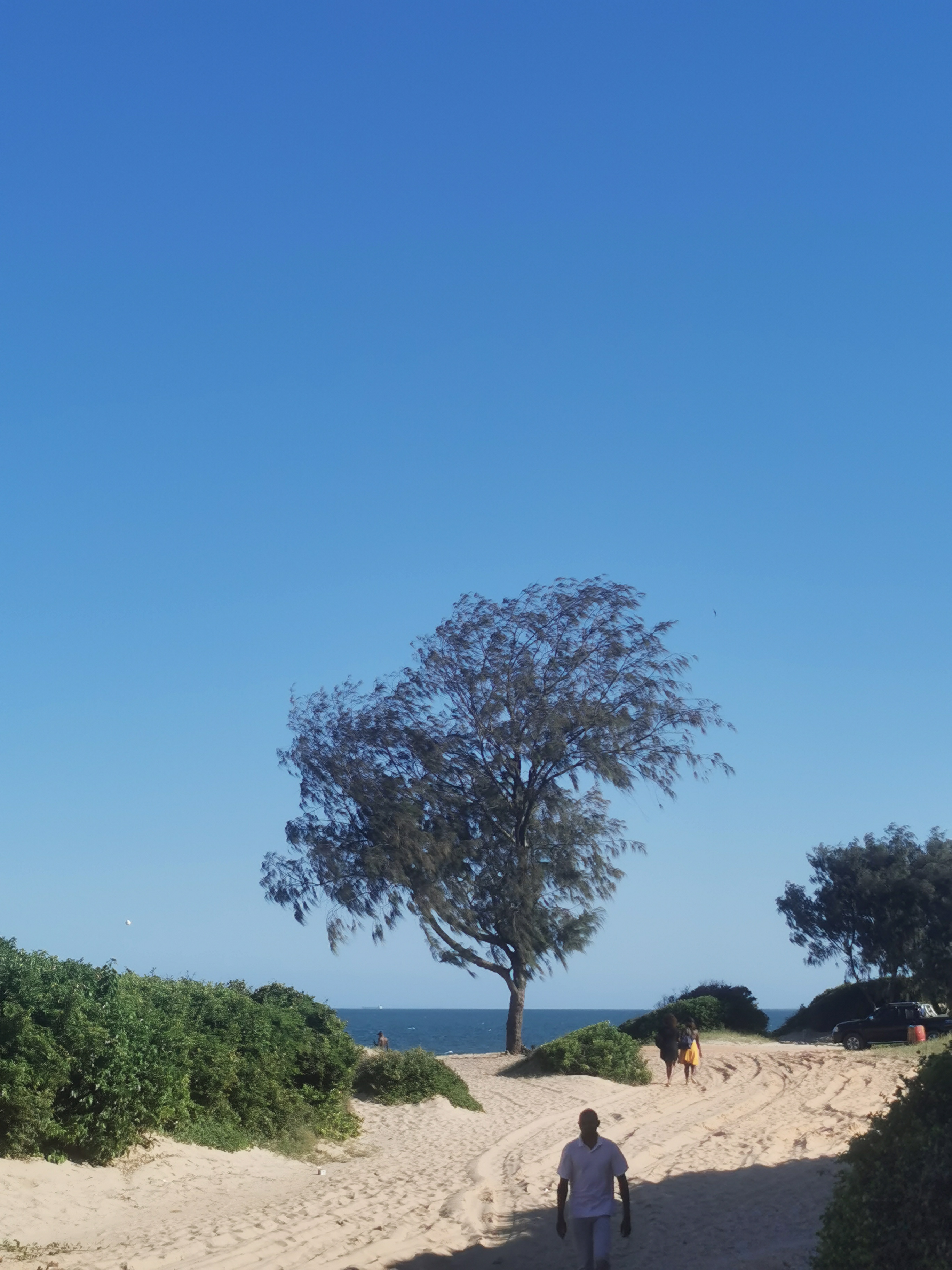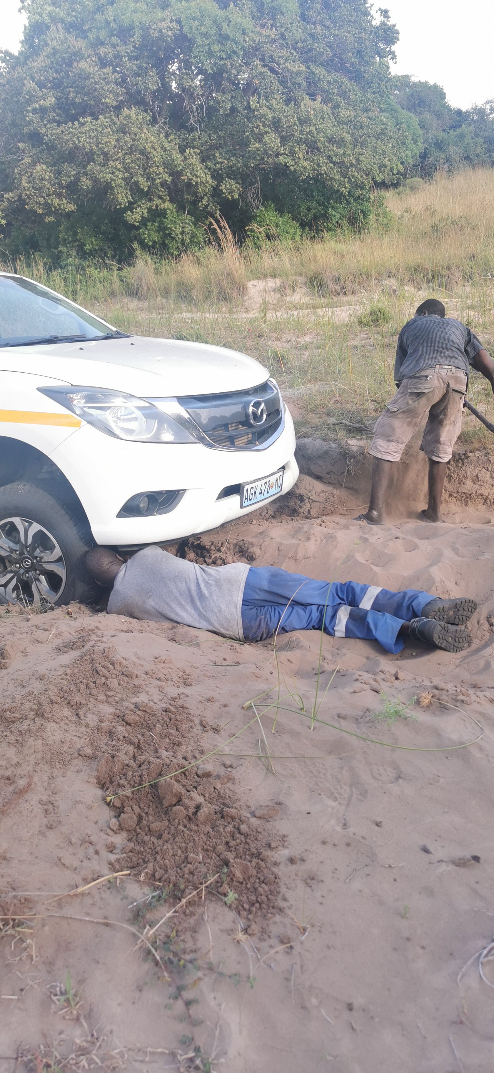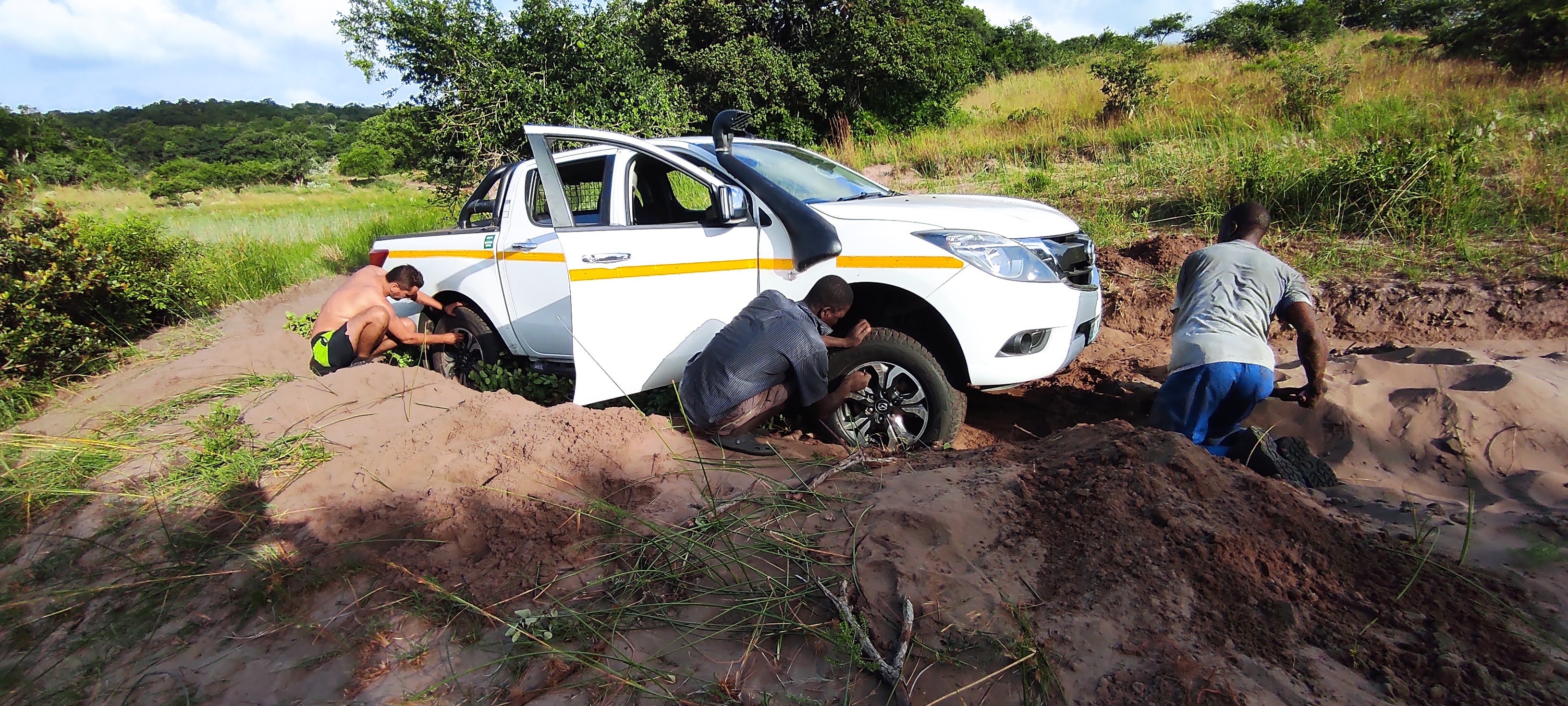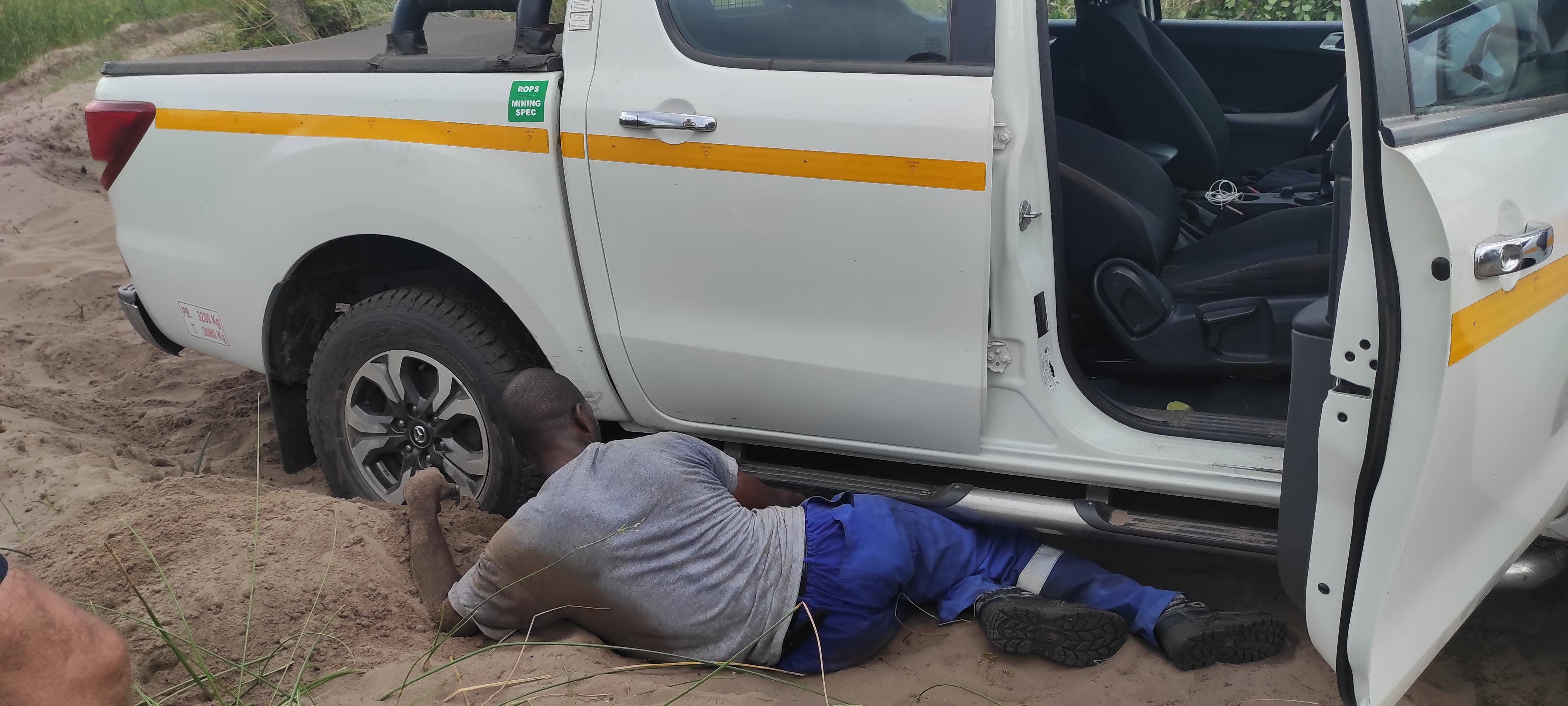 We took a different road back and at one point we ran into trouble. The “road” had a high central ridge and two grooves filled with deep sand. The central ridge was hard, wet sand. The grooves were deep dry sand. At one point we got stranded, the wheels dug into the soft sand and the car was stranded on the ridge. We tried digging with our hands, lifting the car with a jack and putting wood under the wheels but nothing worked. We were stuck.