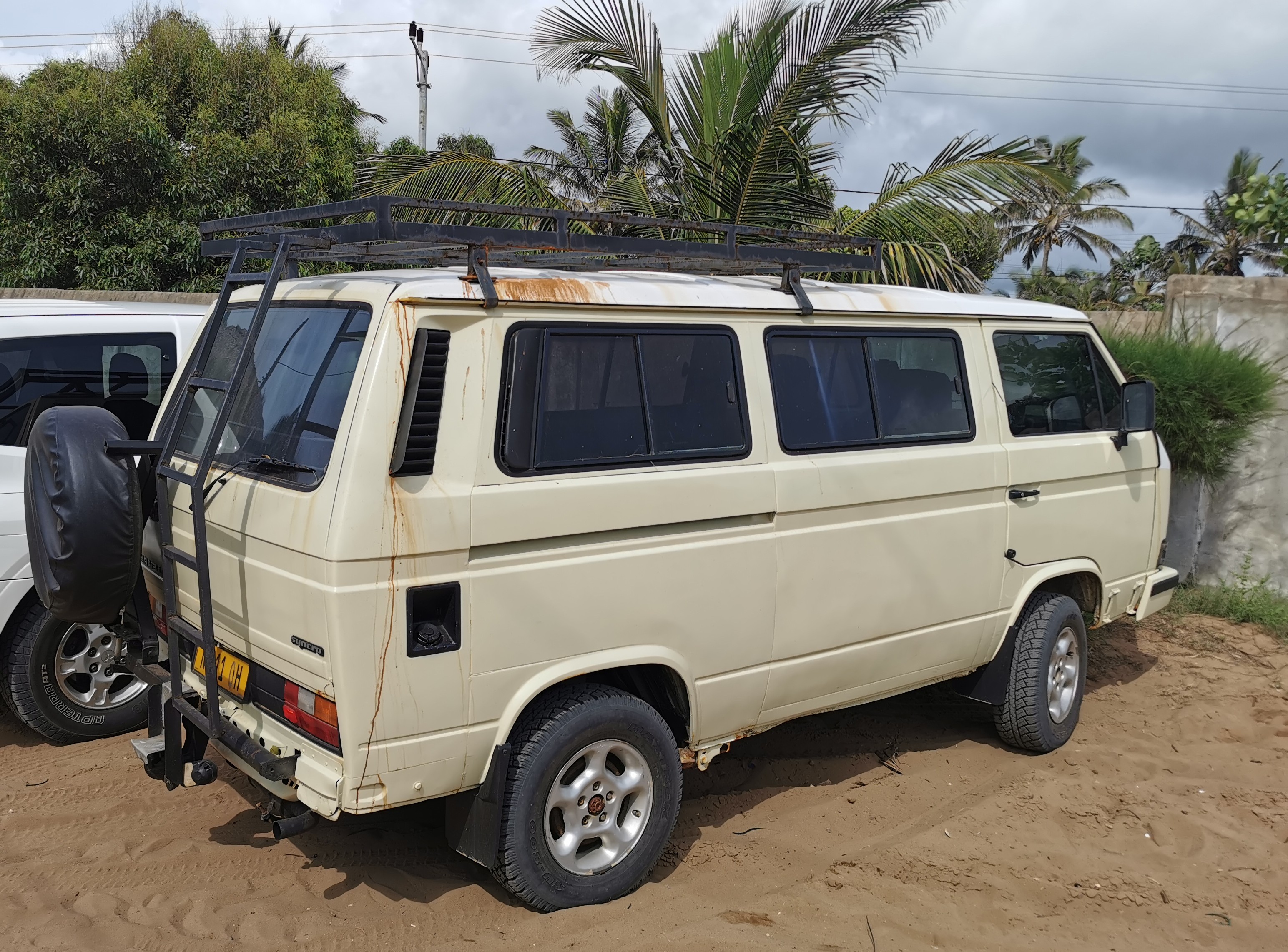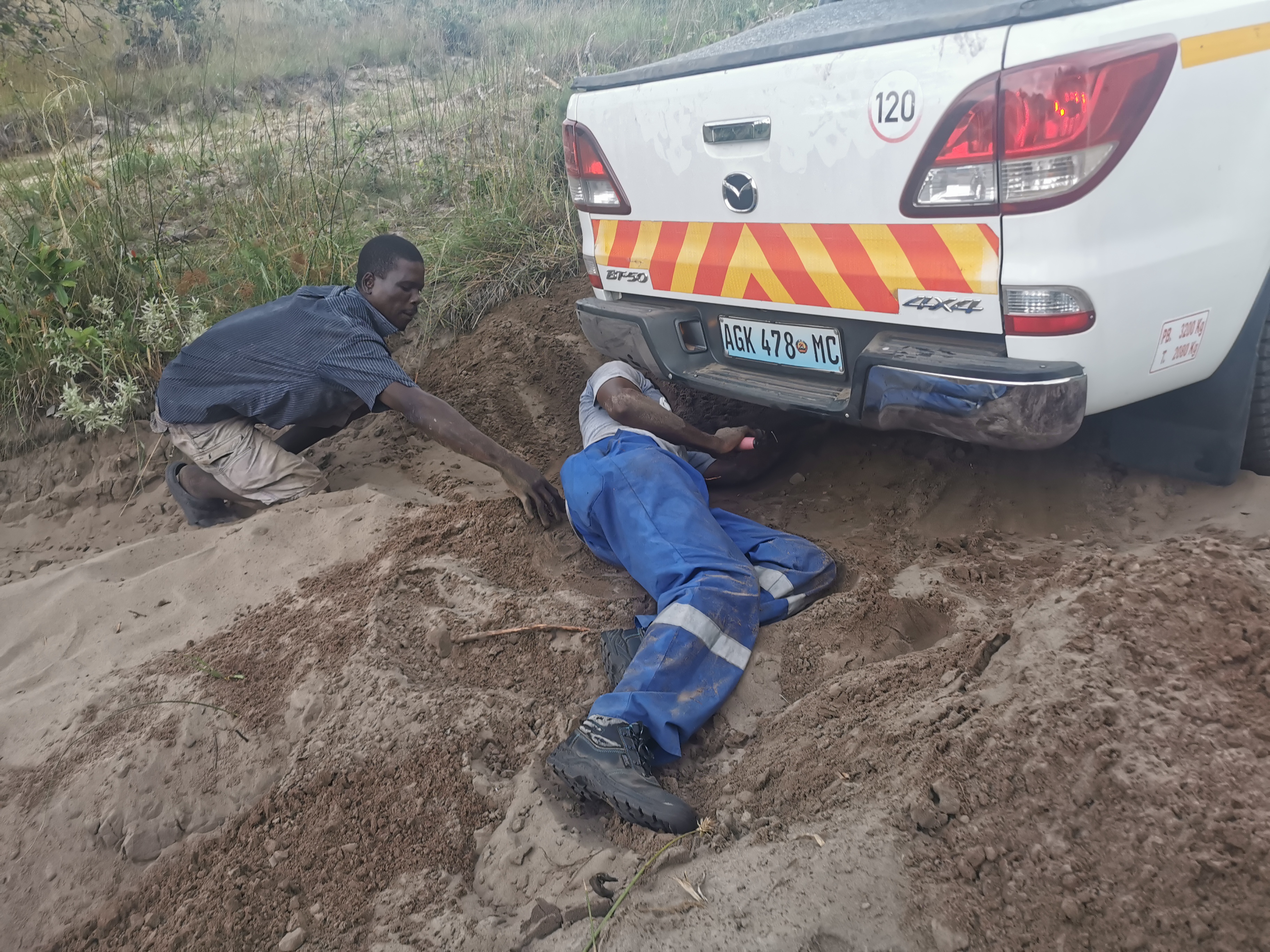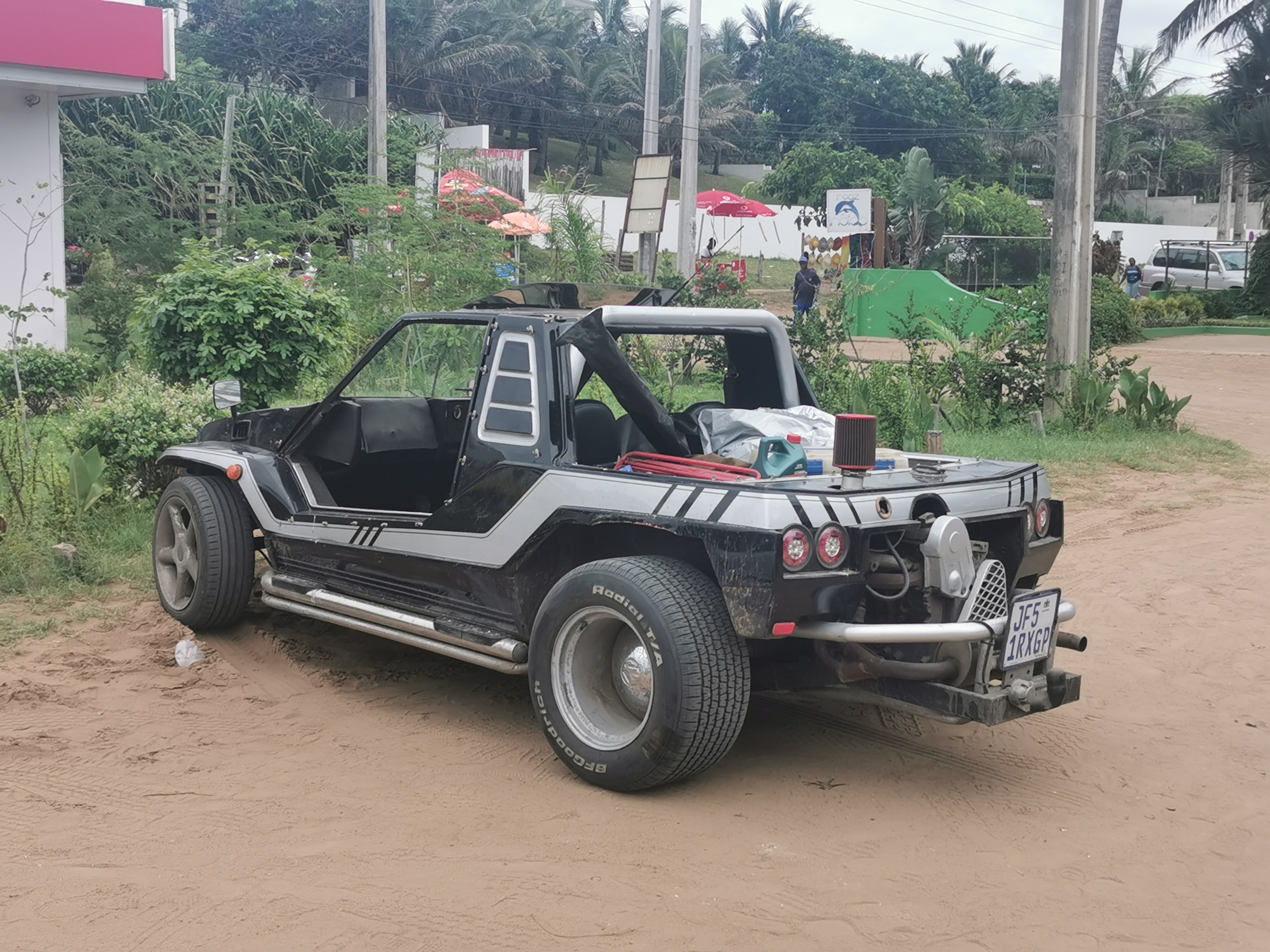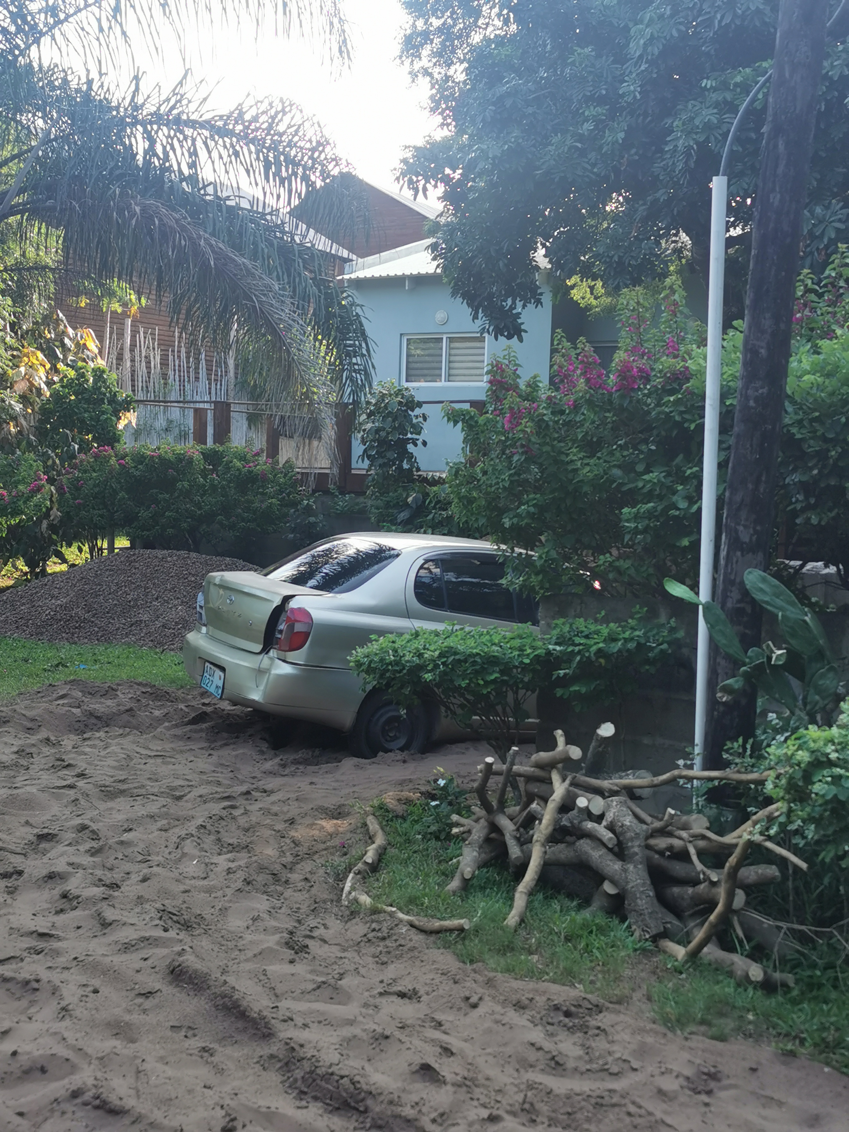 We took a different road back and at one point we ran into trouble. The “road” had a high central ridge and two grooves filled with deep sand. The central ridge was hard, wet sand. The grooves were deep dry sand. At one point we got stranded, the wheels dug into the soft sand and the car was stranded on the ridge. We tried digging with our hands, lifting the car with a jack and putting wood under the wheels but nothing worked. We were stuck.