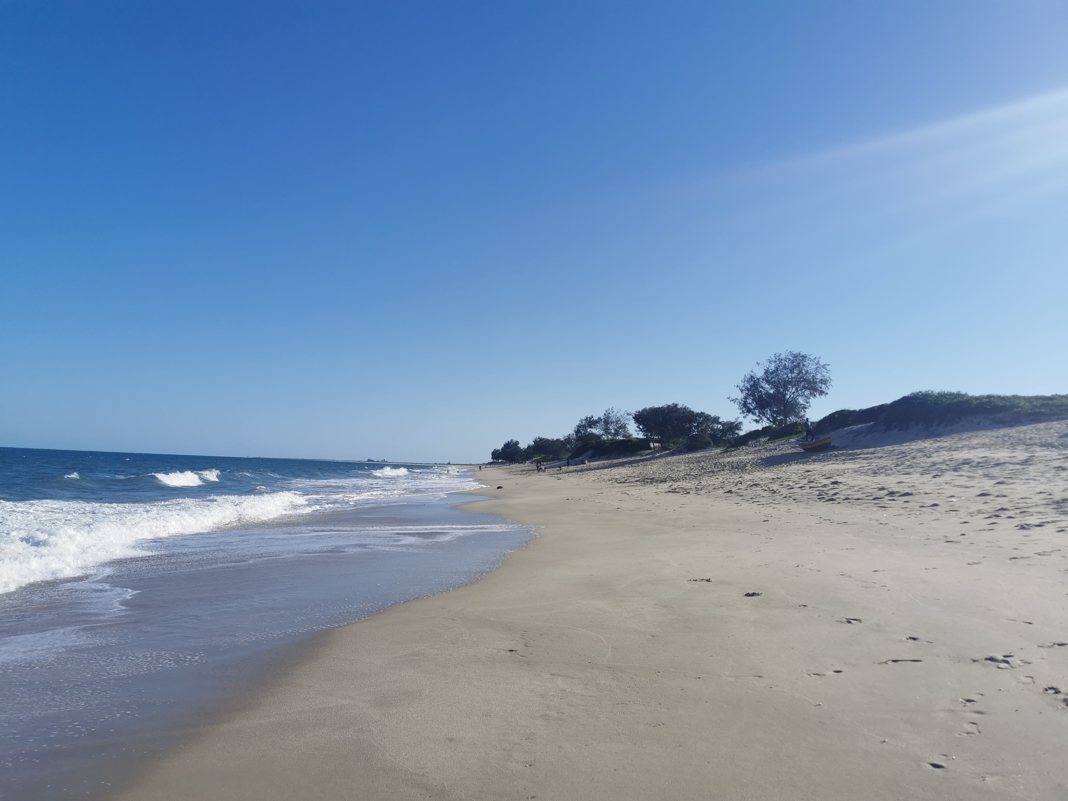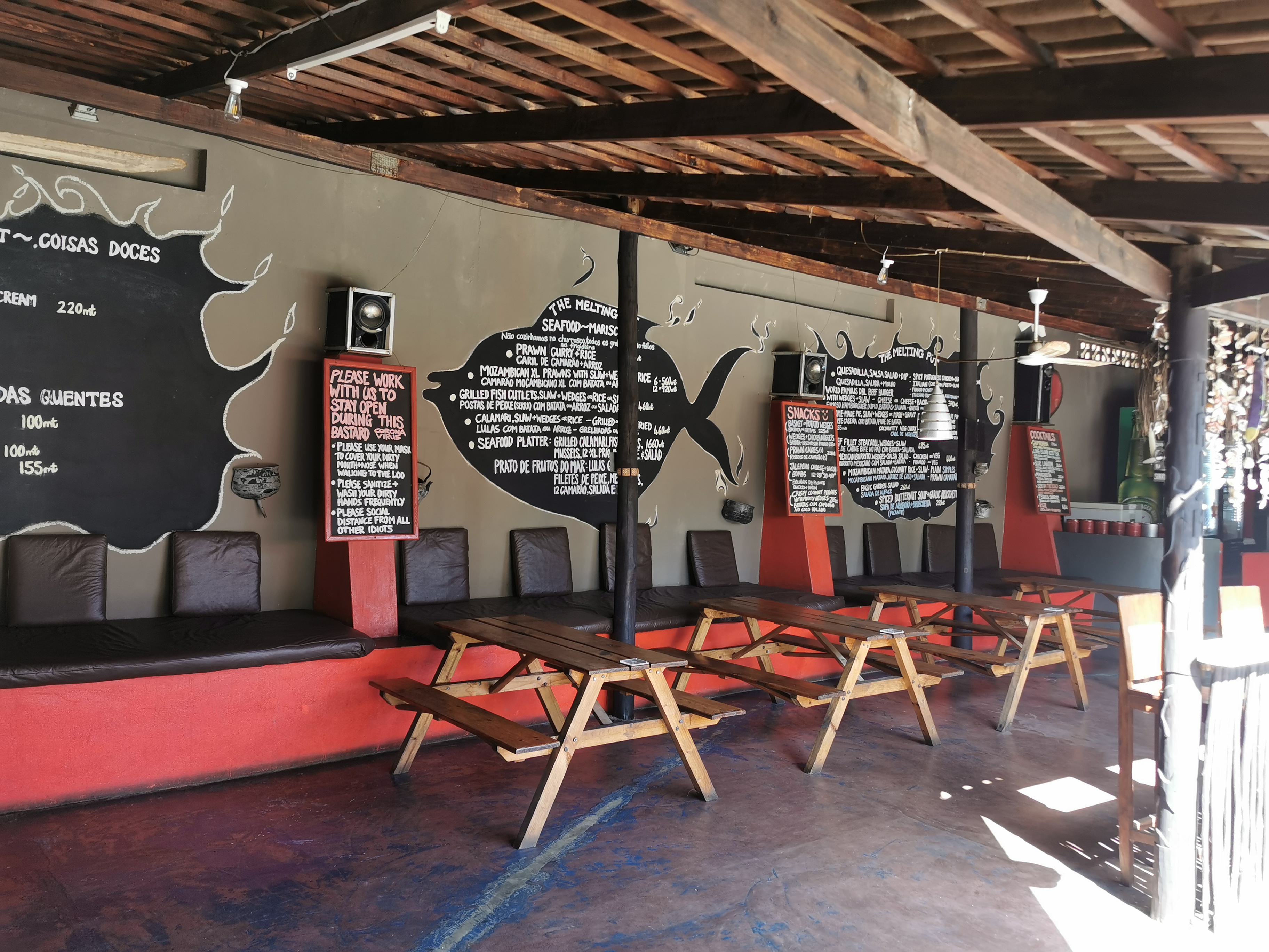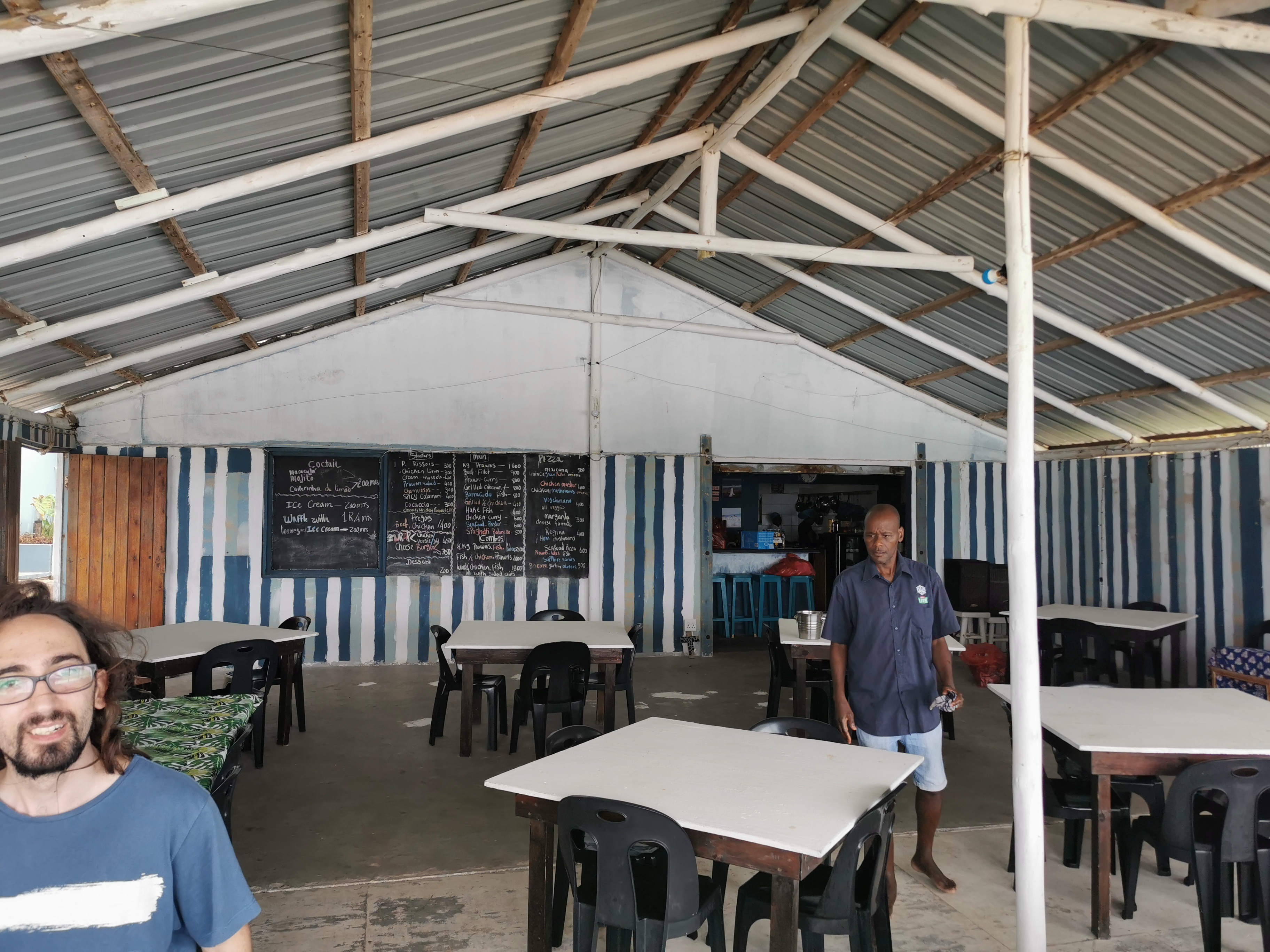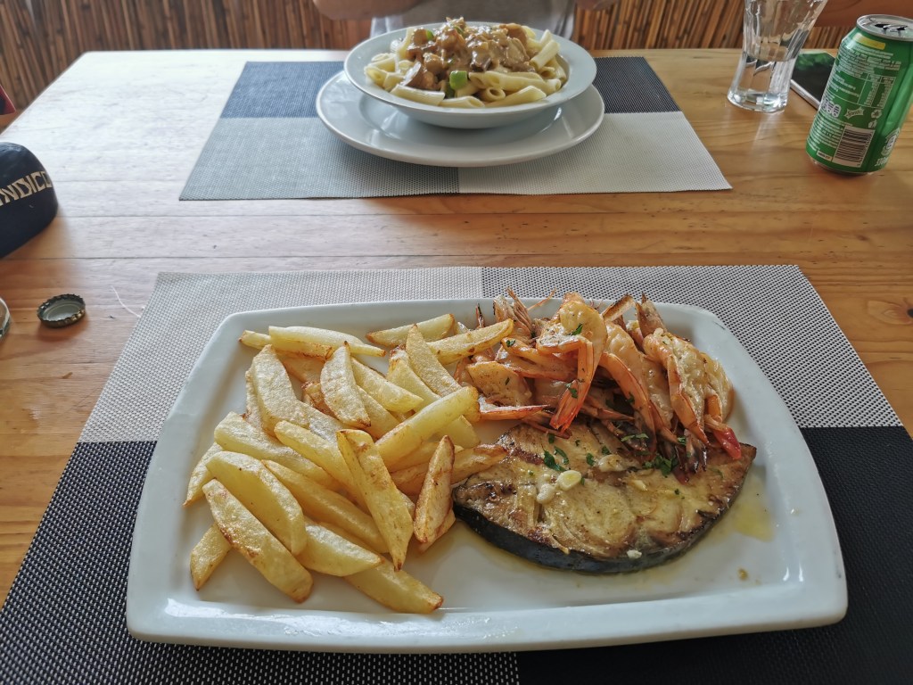 We picked a table and sat down but were asked to move to a smaller table, since we were not a large group. It soon made sense because the place soon got quite full. Even the lower deck got parasols and tablecloths. The view was stunning, open sea and sand beaches went on forever. The fact that it was so inaccessible made it all the more magical. A restaurant at the end of the world. The waiter was a chatty guy, asked whether we came from SA. I guess that’s because he saw us coming in from the beach. We asked about the border, he said there wasn’t one. So you just walk across? Yes, just walk! Africa is nice! he said with a smile.
