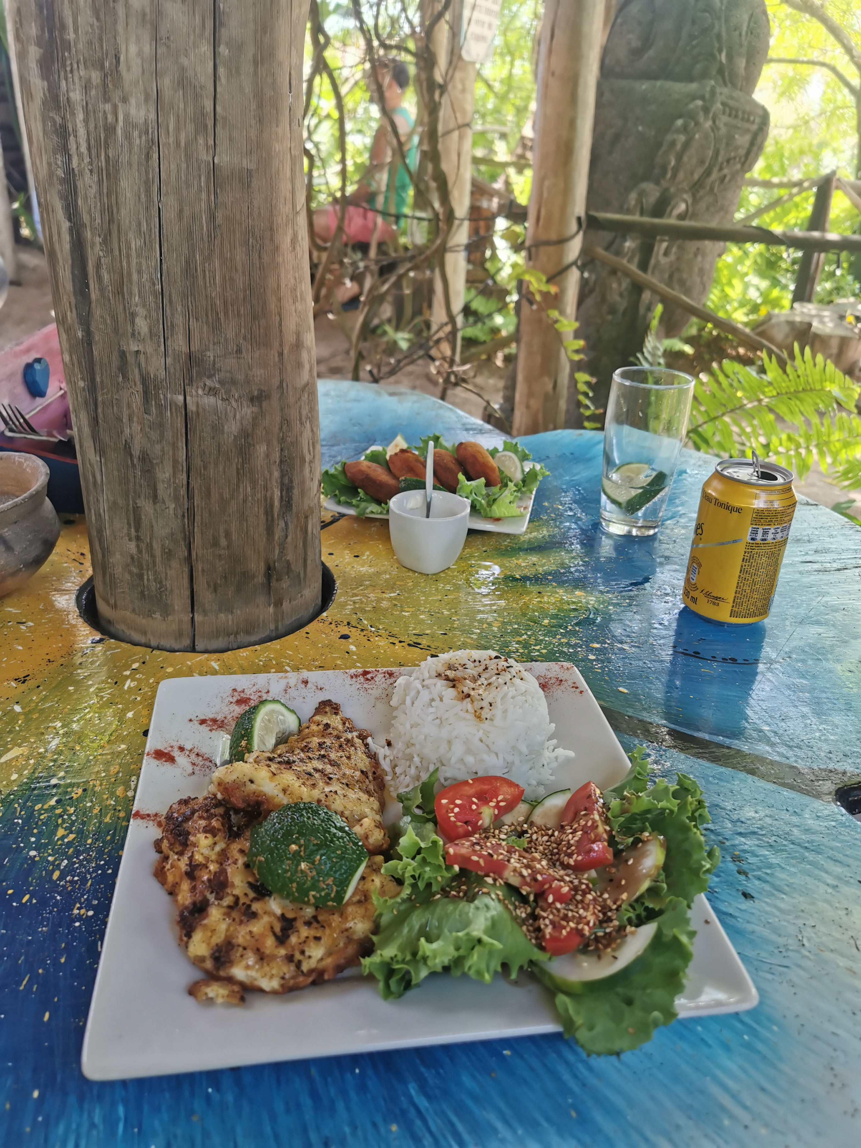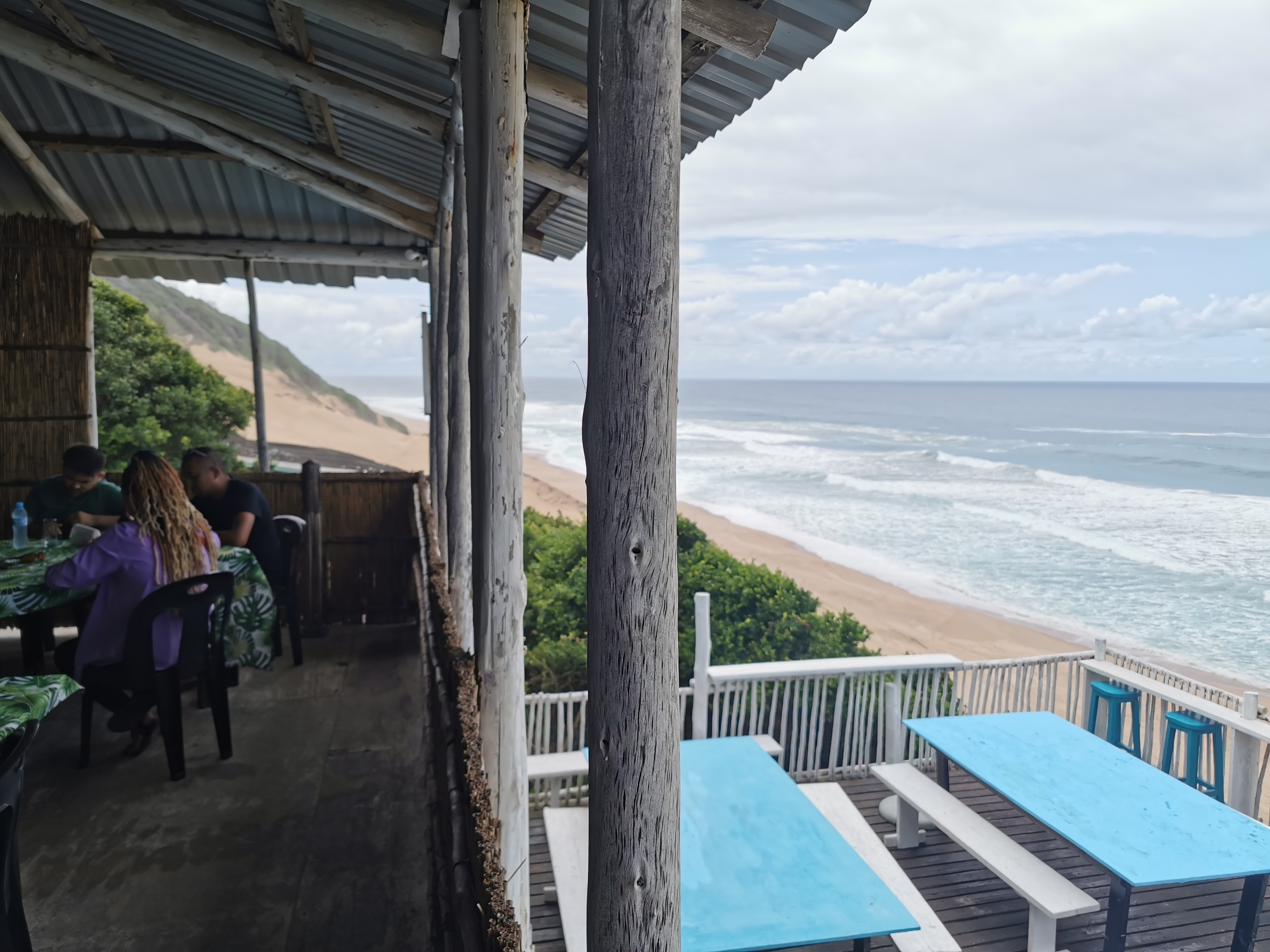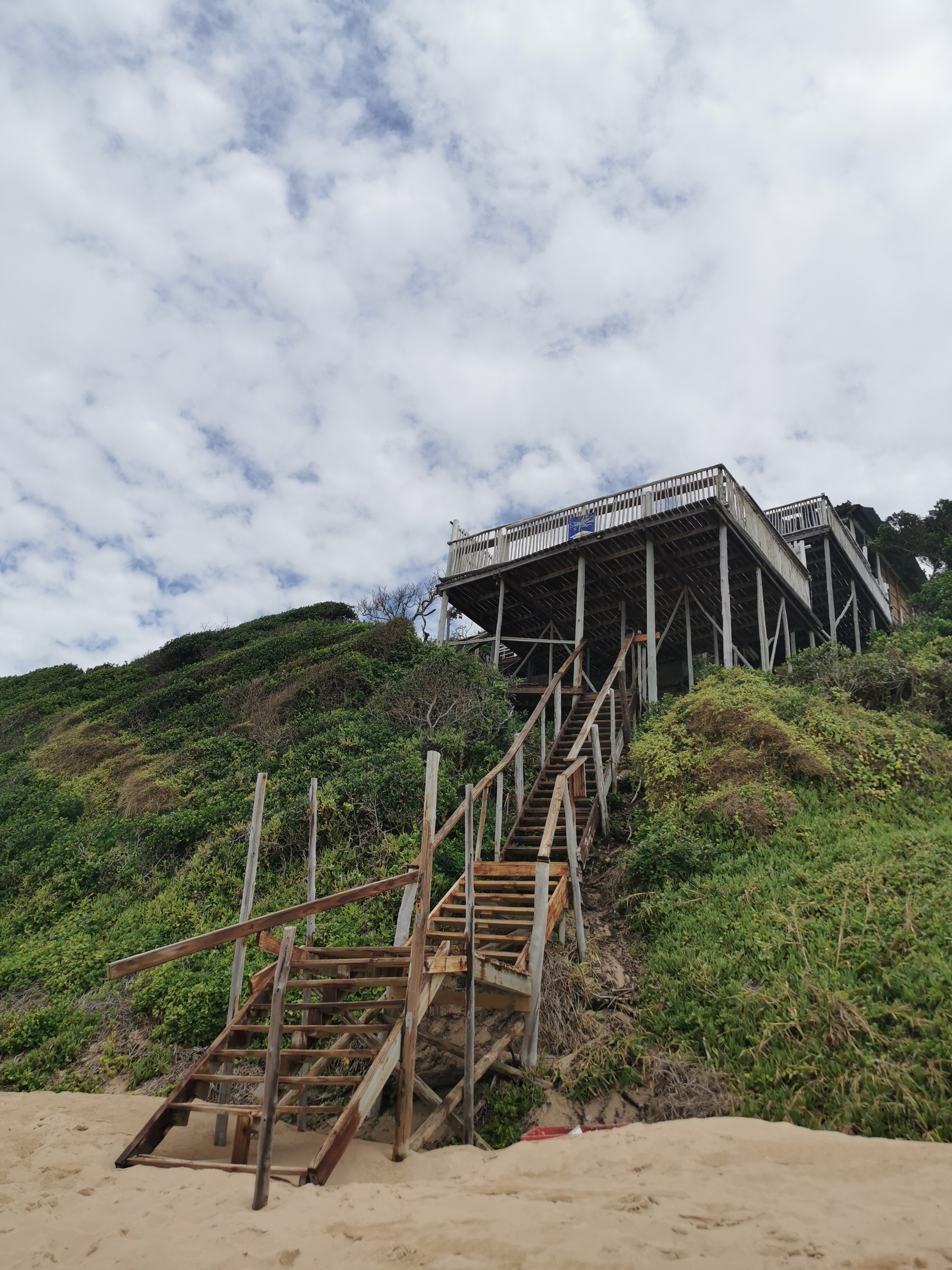 A steep sand slope and very steep stairs lead us to a wooden deck with tables and benches but no sign of recent use. Another flight of stairs took us to another deck with tables, some people and a welcoming waiter. It was open!