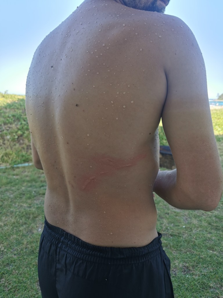 Turns out, not exactly jellyfish but eh, close enough. 🙂 After the sixth sting, I decided it wasn’t worth it and got out. The last one, on my back, was really painful.