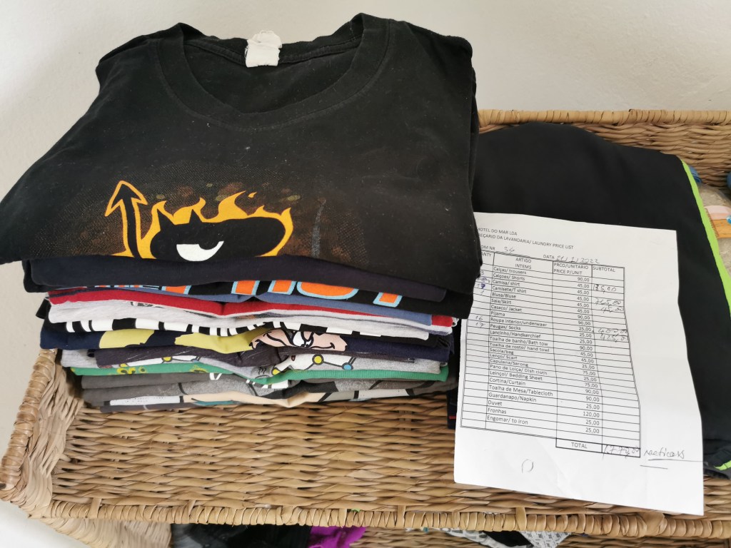 We had our laundry done. We were told we’d have to “pay a little bit” . 18 shirts, boxer shorts and socks between us, 25 Euro. I’d hardly call that a little bit.