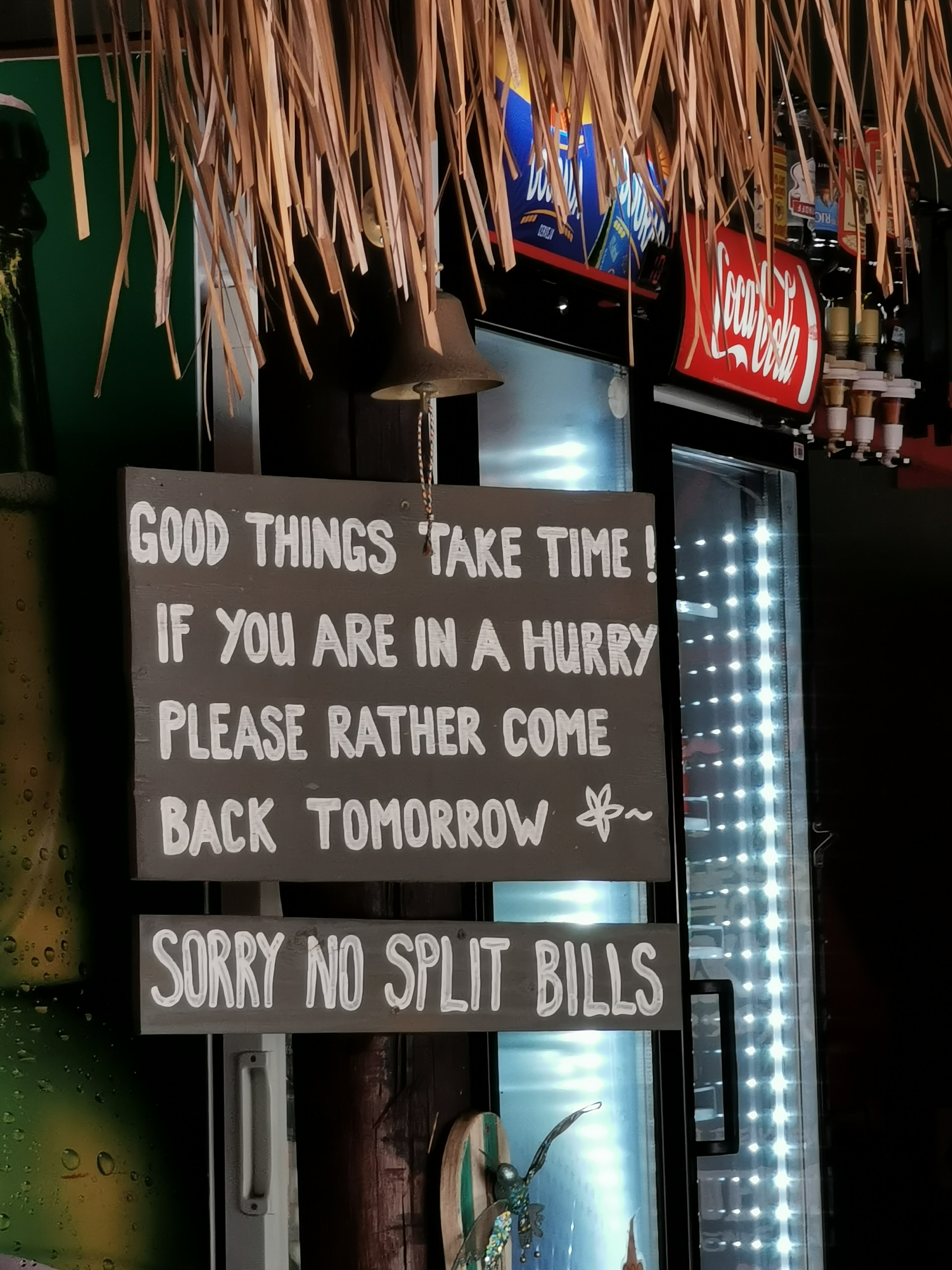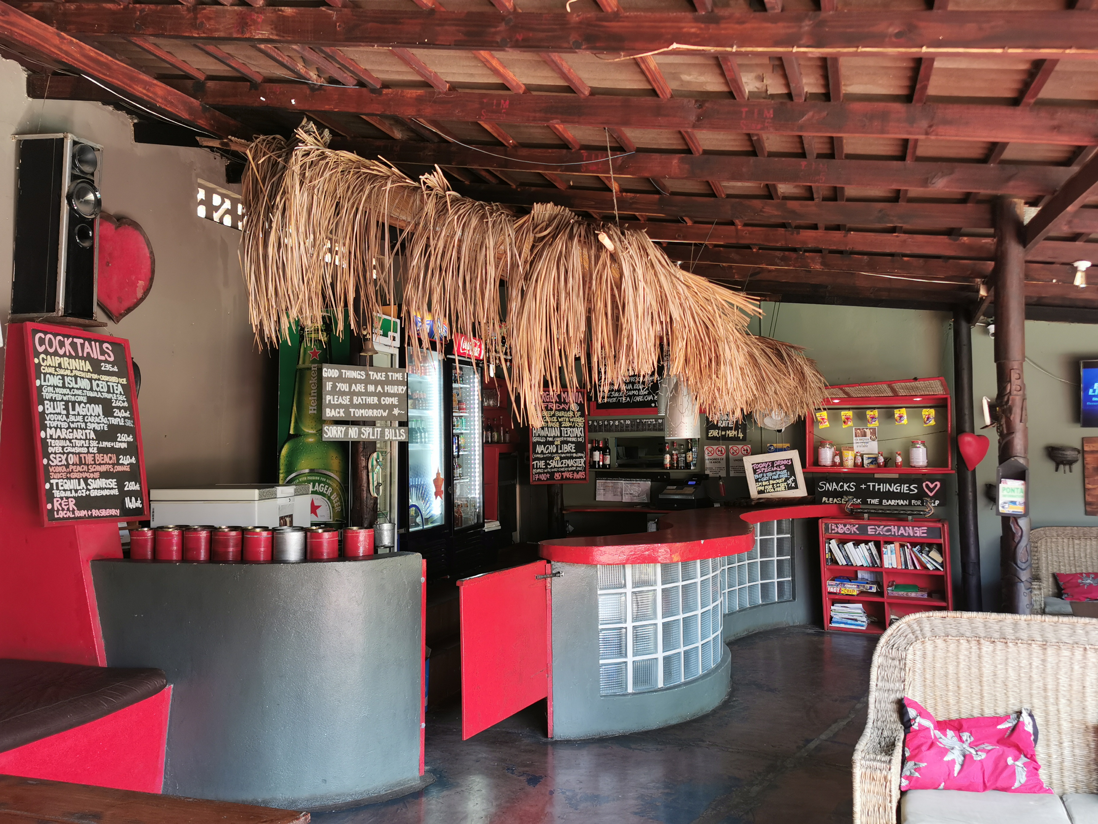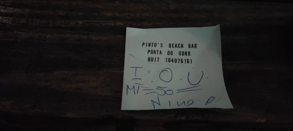So, drinks. We heard music from the beach bar. We figured there must be a path at the edge of the beach that was legal to take. We were stopped by a local. – Beech clozed. We’re trying to get to the beach bar. – Ok, let’s go. I knew where this was going, we weren’t getting rid of him easily. Sure enough, when we got to the place, he sat down with us. Another guy asked if he could join us, his wife had gone home and he was alone. Sure. This guy spoke English and turned out to be quite charming. We bought our guide a beer but he barely spoke any English so we focused our attention on our new friend. I paid cash for the drinks and instead of change got an IOU! Written in pen on a small piece of paper. It made me laugh so hard, it actually put me in a better mood.