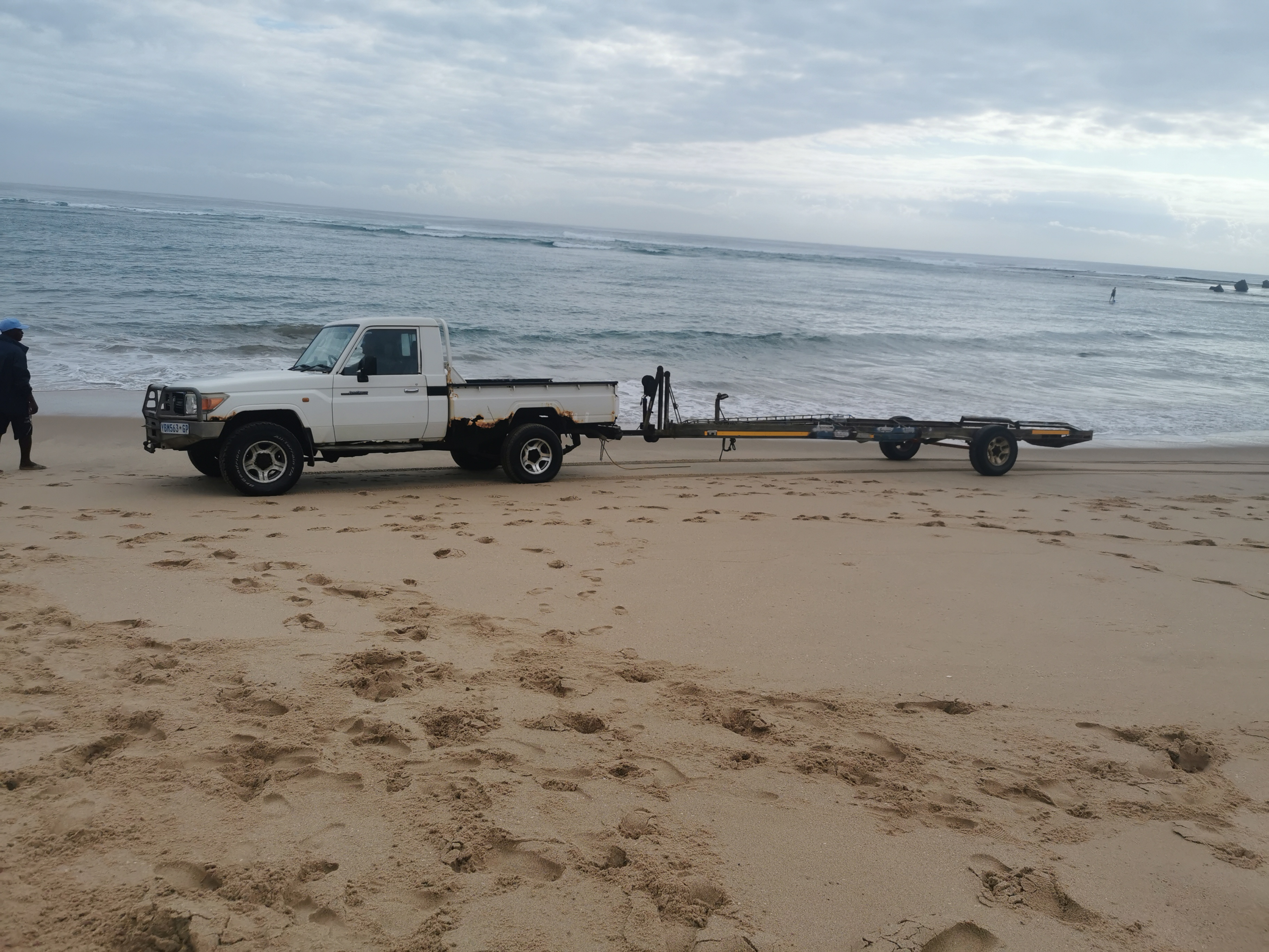 A tractor with a large trailer took us to the beach. There were two groups of four, each with their own instructor. We were told that the ladies were to get on the boat while it was still out on the sand and the gents were to stay out to keep the boat steady in the shallow water. That’s sexist, I exclaimed, I’m going home! I mocked a turn. It got a big laugh from the group. One lady, I’d say american, said good on you, smiling but not exactly laughing. I hope she got I was joking. They use the tractor and a big log to push the boat in.