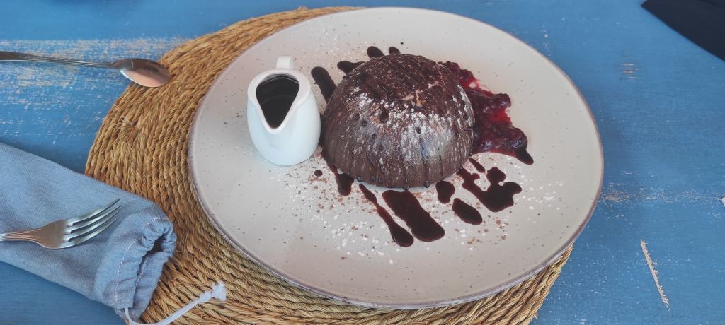 We went for some dessert, we got brownies with ice cream. Mine had a chocolate dome. I began to crack it so the waiter came over to explain I was eating it wrong. The cup of chocolate on the side was hot and I was supposed to pour it over the dome.